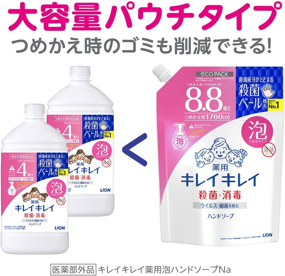 キレイキレイ 薬用 泡ハンドソープは、有効成分イソプロピルメチルフェノールの殺菌力で、手肌に潜むウイルスや細菌をしっかり除去します。独自の「殺菌ベール処方」により、殺菌成分が手にとどまり、洗浄後も手肌をバイ菌から守り続けます。シトラスフルーティの爽やかな香りは手に残りにくく、お子様から大人まで家族全員で使いやすい低刺激処方です。この詰め替え大容量サイズ1760mlは、毎日の手洗いを経済的にサポートします。